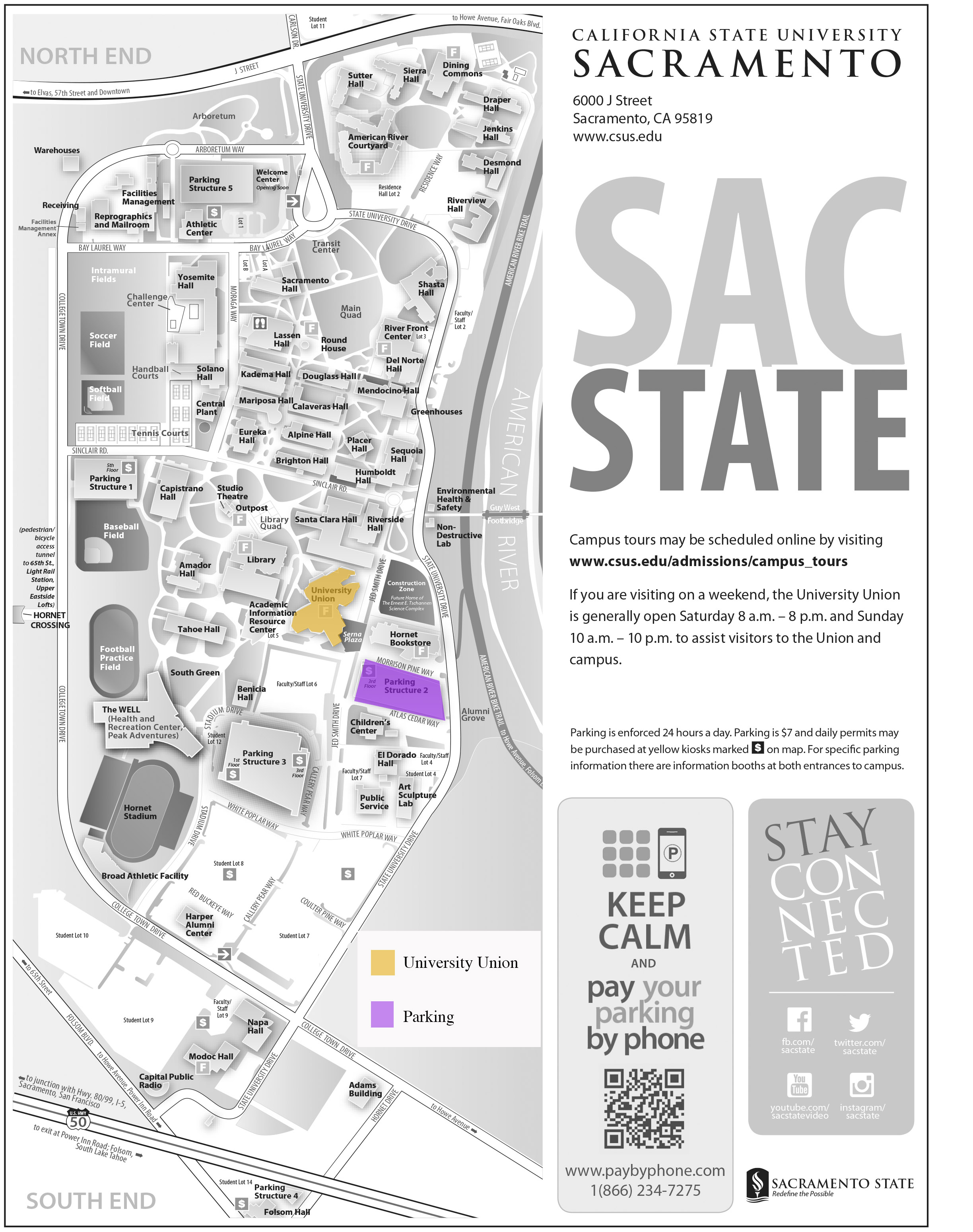 Where do I park? There is a parking structure right next to the University Union (see map for purple highlighted parking structures). We suggest that you park in Parking Structure 2. You will need to pay for parking. You can do that by paying at one of the kiosks in the parking structure OR by using the QR code on the campus map to pay by phone. If you are using the QR code and your smart phone to pay, use the parking code 5115. (You will be prompted for this code when paying with your phone.)